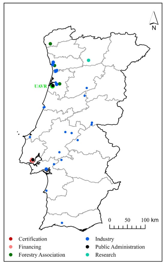 The workshop was attended by fifteen Portuguese entities, representing six forest sectors (Figure 2 and Figure 3A). The geographical representation of the stakeholders highlights their distribution across Portugal, showing the involvement of stakeholders from various regions from the north to the south, both from coastal and inland areas.