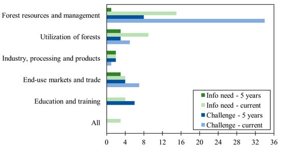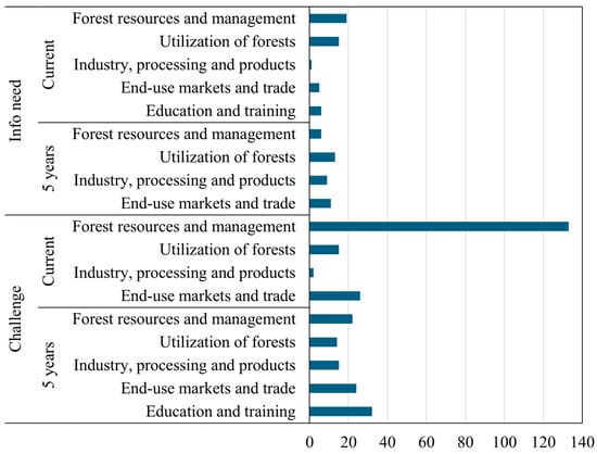 When grouping the identified topics per theme, forest resource management has the highest number of identified challenges and information needs, mostly in the short term, with a total of 58 topics identified. Utilization of forests and end-use markets and trade has a similar number of topics (20 and 18, respectively) with a high number of topics identified at present. The themes with fewer topics are industry, processing, and products. The education and training theme had six challenges for the 5-year period, mostly related to training, and four current information needs, mostly related to education. There were three topics identified by the stakeholders that fit all FWC themes, which were, therefore, grouped as “All” (Figure 4).