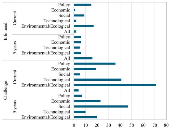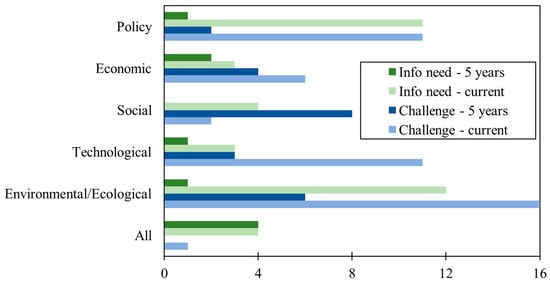 To contextualize the information gathered during the workshop, a PESTE approach was taken to group each topic according to each category—Policy, Economic, Social, Technological, and Environmental/Ecological. The analysis of PESTE categories (Figure 5) showed that the most relevant challenges and information needs were in Environmental/Ecological and Policy categories. Of the Environmental/Ecological topics, circa 80% were current challenges and information needs, with only 20% identified for the 5-year period. The only category with a higher number of topics for the 5-year vs. current was Social. Two PESTE categories, Economic and Technological, included a high number of topics in challenges. There were nine current information needs that fitted into “All” PESTE categories.