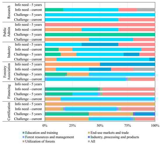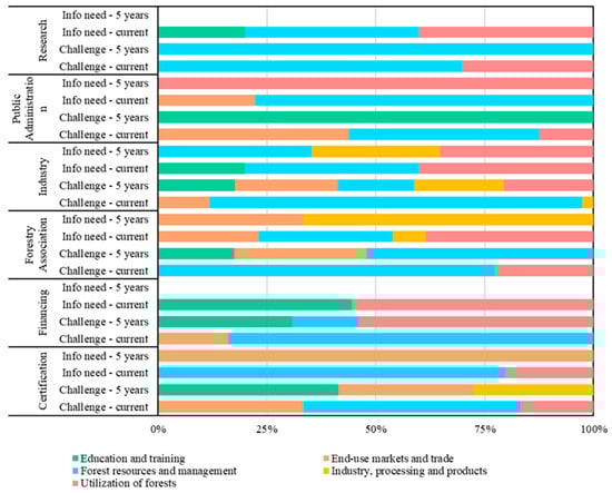 When analyzing the themes per activity sector and period, the Research and Industry sectors were mostly concerned with the forest and resource management, while the public administration ones were concerned with the utilization of forests. The Certification sector had a high relative contribution of topics in the end-use markets and trade theme; finally, the Forestry Association and Financing sectors have more balanced and overarching concerns, with a more evident relative contribution of industry, processes, and products (Figure 6). The education and training theme was identified in all activity sectors. While topics mentioned by the Public Administration, Industry, Forest Associations, and Certification fit in both time periods, Research and Financing entities did not identify information needs for the 5-year period.