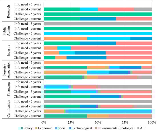 Considering the 116 identified topics, the stakeholders revealed more challenges than information needs, most of which focused on the present time. These results were mainly justified by the stakeholders with a greater number of difficulties and restrictions faced currently by the sector, along with the fact that a 5-year timeframe is too short when taking forest ecosystems development rates into account. Indeed, when we consider that trees take years to decades to reach maturity, meteorological patterns—considering, or not, climate change—vary yearly, influencing the conditions for tree growth, and that management decisions made today can take years to produce relevant outputs, a 5-year timeframe is short in forestry.
