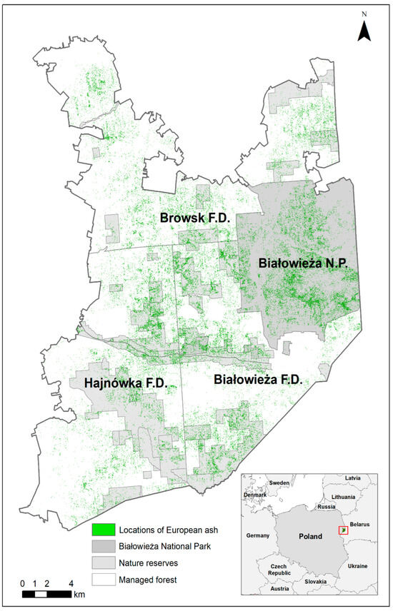 Map illustrating the location of the Białowieża Forest, including its subdivisions into forest districts and the national park. The distribution of European ash trees, as recorded in July 2015, was determined using the methodology described by Kamińska et al. [27] and Lisiewicz et al. [34].