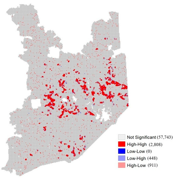 - Anselin, L. Local Indicators of Spatial Association—LISA. Geogr. Anal. 1995, 27, 93–115. [Google Scholar] [CrossRef]