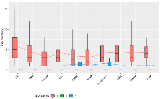 An interaction plot was analyzed to examine the number of dead ash trees per 1-hectare cell from 2015 to 2019 across LISA classes identified through hotspot analysis and the ’dominant species’ category. Regardless of the dominant species, the high–high LISA classes showed the highest response values, followed by the low–high class. The lowest values were observed in the low–low class, where no ash mortality was recorded. The highest number of dead ash trees per 1 ha cell was observed in locations dominated by ash (mean = 6.29 ± 4.69), and the lowest in locations dominated by birch (mean = 3.16 ± 2.38). “Low–high” locations were not detected in ash, lime, and maple locations (Figure 4).