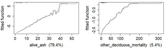 The results of the BRT analysis indicated that the number of living ash trees was the primary factor influencing the response, with a relative importance of nearly 80%. The second most important factor was mortality of other deciduous species (5%) (Table 4). Other variables had minimal impact (<3%). The BRT model explained 87% of the randomly selected input data and predicted 82% of the excluded data.