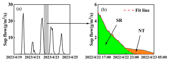 The forecasted refilling is used to differentiate SR and NT following the method mentioned by Fisher et al. (2007) [5]. The method is based on the following assumptions: (1) SR and NT occur simultaneously; (2) when the nocturnal VPD is small, the corresponding nocturnal sap flow is considered to be SR; and (3) sap flow decreases at night as solar radiation decreases, and if there is no water loss, the sap flow will tail off to zero. Therefore, nocturnal sap flow is first multiplied by sapwood area to obtain the nocturnal transpiration rate. Based on the initial slope of the nocturnal transpiration rate curve, a logarithmic function is used to fit its trend (Equation (12), Figure 2). The area below the fitted curve represents nocturnal SR (Equation (13)), while the area enclosed between the fitted curve and the actual water consumption curve represents NT (Equation (14), Figure 2b).
