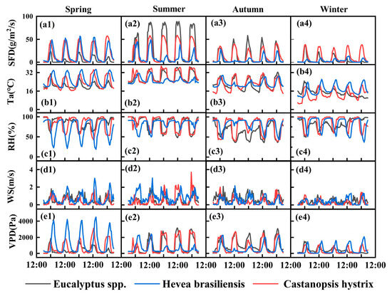 Diurnal variation curves of sap flow density and meteorological variables. Note: SFD represents sap flow density, Ta represents temperature, RH represents relative humidity, WS represents wind speed, and VPD represents vapor pressure deficit, (a–e) represents the diurnal variations in sap flow density, temperature, relative humidity, wind speed, and VPD for three tree species, (1–4) representing spring, summer, autumn, and winter, respectively.