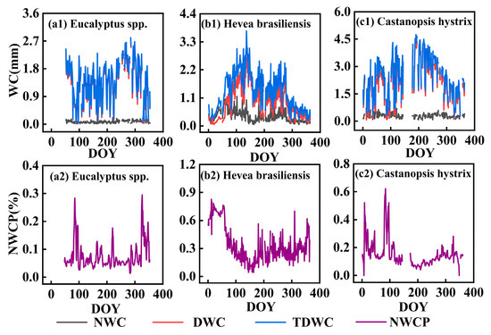 Overall, the NWC of the Hevea brasiliensis plantation (0.36 ± 0.22 mm/d) is higher than that of the Castanopsis hystrix plantation (0.14 ± 0.05 mm/d) (Figure 4 and Figure 5) and significantly higher than that of the Eucalyptus spp. plantation (0.08 ± 0.03 mm/d, Figure 5). NWC is generally lower than daytime water consumption, as shown in Figure 4. Unlike daytime water consumption, which exhibits similar daily variation patterns, NWC shows inconsistent daily variation patterns of total daily water consumption for all three plantations (Figure 4). Daily variation of NWC in the Eucalyptus spp. plantation remains relatively stable at a low level (less than 0.10 mm/d) throughout the whole year, while those of both the Castanopsis hystrix plantation and the Hevea brasiliensis plantation exhibit low values during the rainy season and high values during the dry season.