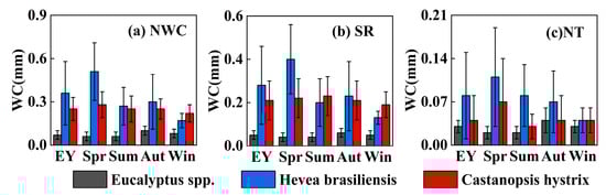 In this study, SR plays a predominant role over NT in NWC (Figure 6). This finding is consistent with previous research by Wu et al. [7], Yu et al. [6], and Phillips et al. [8]. Similar to NWC, the proportions of both SR and NT vary seasonally in different plantations, with higher proportions during spring and autumn, and lower proportions in summer and winter (Figure 6).