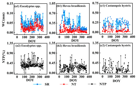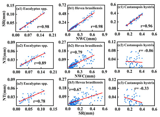 Strong positive correlations between NWC and SR can be observed in all three plantations, with correlation coefficients (r) all exceeding 0.95 (Figure 7a1,b1,c1). This may indicate that SR is more indicative of a physiological need. Strong positive correlations between NT and NWC can be observed in both the Hevea brasiliensis plantation (r = 0.79) and the Eucalyptus spp. plantation (r = 0.89), while there is no correlation in the Castanopsis hystrix plantation (r = −0.06). Additionally, strong positive correlations between SR and NT can also be found in the Hevea brasiliensis plantation (r = 0.67) and the Eucalyptus spp. plantation (r = 0.78), while there is a weak negative correlation in the Castanopsis hystrix plantation (r = −0.33).