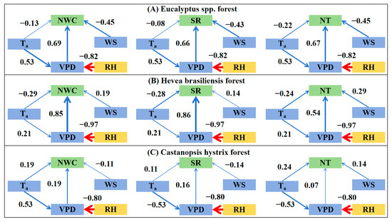 In the Castanopsis hystrix plantation, NWC shows a weak positive correlation with VPD (r = 0.26, p < 0.1) and Ta (r = 0.28, p < 0.1), and basically no correlation with other factors. During the rainy season, correlations between NWC and meteorological factors are slightly stronger. During the dry season, however, these correlations are very small, almost negligible. It is worth noting that although Ta has the strongest relevance with NWC, it can only explain 9.40% of its variability (Table 4). The SEM also confirms that the meteorological factors have a weak influence on the NWC of the Castanopsis hystrix plantation (Figure 8, < 0.20).