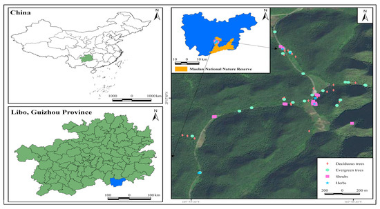 The study region is situated in Guizhou Libo Karst Forest Ecosystem Observation and Research Station (107°52′10″ to 108°05′40″ E; 25°09′20″ to 25°20′50″ N) in Maolan National Nature Reserve in Guizhou province, which encompasses the largest expanse of primary forest in karst regions (Figure 1). The topography features higher elevations in the northwest and lower elevations in the southeast, with the highest point reaching 1078.6 m and the lowest point at 430.0 m; the average altitude ranges from 550 to 850 m. The region experiences a subtropical monsoon humid climate, with an annual average temperature of 18.3 °C. The average temperature in July is 23.5 °C; in January, it reaches 5.2 °C. The annual average humidity is 83.0%, and the annual average precipitation is 1752.5 mm. There are 1272.8 annual sunshine hours, with a frost-free period spanning 315 days; the total solar radiation for the year is 63,289.80 kW·m−2, and the accumulated temperature (≥10 °C) is 4598.6 °C. In this study, the soil considered is mainly black lime soil, which has good fertility and is abundant in organic matter and other essential nutrients [22].