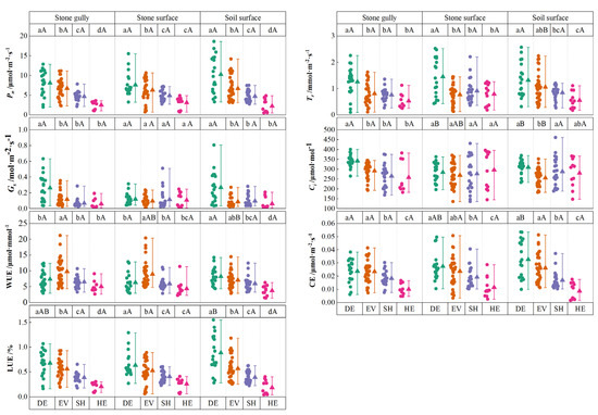 Photosynthetic characteristics of various plant life forms in three microhabitats. Capital letters indicate significant variations among the same plant life forms in various microhabitats (p < 0.05). Lowercase letters indicate significant variations among various plant life form in the same microhabitat (p < 0.05). “▲” indicates the average value of each indicator. The letters DE, EV, SH, and HE indicate deciduous trees, evergreen trees, shrubs, and herbs, respectively. Different color dots represent the photosynthetic characteristics of different life forms of plants. Green represents deciduous trees, orange represents evergreen trees, purple represents shrubs, and purplish red represents herbs.