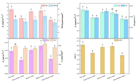 Plant photosynthetic characteristics versus slope aspect. Various lowercase letters indicate that the photosynthetic characteristics were remarkably varied among the different slope aspects (p < 0.05).