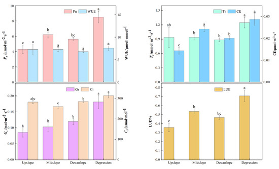 In this study, the Pn, Gs, CE, and LUE values were largest in plants growing in depressions and smallest in plants growing on upslopes (p < 0.05). Plants in depression regions exhibited the highest Pn, Gs, CE, and LUE values, likely due to greater soil moisture availability and lower evaporative stress. Conversely, plants in sloped regions faced significant water limitations, resulting in reduced stomatal conductance and lower photosynthetic rates.