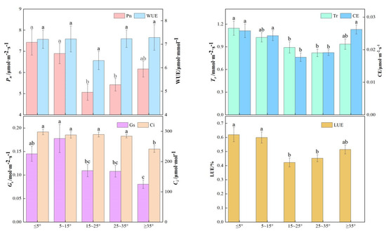 Plant photosynthetic characteristics versus slope steepness. Lowercase letters indicate that the photosynthetic characteristics were remarkably varied in relation to the slope degree (p < 0.05).