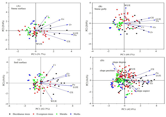The PCA biplot illustrates the relationship between photosynthetic characteristics and microhabitats (Figure 6A–C). The results indicated that the various types of plant were distributed differently in microhabitats. For stone surfaces, the rates of the contribution of PC1 and PC2 to the total variance were 51.7% and 29.4%, respectively, and the cumulative rate of contribution was 81.1%. Evergreen trees were mainly located in the negative region of PC2, with higher values for the Pn, WUE, CE, and LUE. Deciduous trees were mainly located in the positive region of PC1, with higher values for the Pn, Tr, Ci, Gs, WUE, CE, and LUE. For stone gullies, the rates of contribution of PC1 and PC2 to the total variance were 60.1% and 20.1%, respectively, and the cumulative rate of contribution was 80.1%. Evergreen trees and deciduous trees were mainly located in the positive region of PC1, with higher values for the Pn, Tr, Ci, Gs, WUE, CE, and LUE. For soil surfaces, the rates of contribution of PC1 and PC2 to the total variance were 62.3% and 19.6%, respectively, and the cumulative rate of contribution was 81.9%. Evergreen trees were mainly located in the negative region of PC2, with higher values for the Pn, WUE, CE, and LUE. Deciduous trees were mainly located in the positive region of PC1, with higher values for the Pn, Tr, Ci, Gs, WUE, CE, and LUE. This indicated that evergreen and deciduous trees exhibited higher photosynthetic efficiency and drought resistance across the three microhabitats, enabling them to withstand adverse external conditions and adapt effectively to karst habitats. Most of the herbs and shrubs in the three microhabitats were located in the negative region of the PC1, indicating that they had a weak photosynthetic capacity in the three microhabitats.