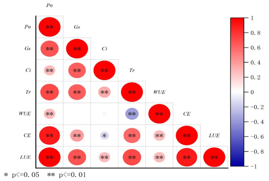The correlation of plant photosynthetic characteristics. The scale on the right indicates the magnitude of the correlation coefficient, with red signifying a positive correlation and blue denoting a negative correlation. The size of the circle is proportional to the strength of the correlation, with larger circles representing stronger correlations.