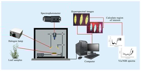 To optimize imaging conditions, the halogen lamp was preheated for 15 min prior to data collection. Calibration involved capturing a black reference image (blocking the camera lens) and a white reference image (Teflon plate with 99.9% reflectance). During scanning, leaves were placed on a black background to ensure consistent reflectance measurements. After completing image correction, the Region of Interest (ROI) for each sample image was selected using ENVI 5.3 software, and the average reflectance spectrum of the ROI was calculated as the characteristic spectrum of the sample. The experimental configuration of the Vis/NIR-HSI system is depicted in Figure 1.