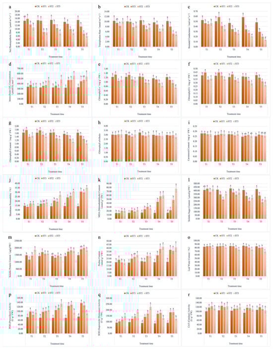 Salt stress induced significant changes in various physiological parameters of Salix matsudana × alba (Figure 2). Photosynthetic parameters, including Pn, Tr, and Gs, declined significantly with increasing salt stress. Specifically, Pn decreased from 14.5 µmol m⁻2 s⁻1 in the control group (CK) at T1 to 6.1 µmol m⁻2 s⁻1 under high salt stress (ST3) at T5, reflecting a marked reduction in photosynthetic efficiency as salt stress intensified.
