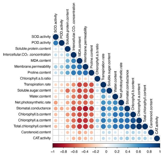 Ci and MDA content showed a positive correlation with chlorophyll content, suggesting that increased oxidative stress and CO2 retention might contribute to enhanced chlorophyll synthesis under certain stress conditions. Membrane permeability was strongly positively correlated with MDA content and proline content, emphasizing the role of membrane stability and osmotic adjustment in the plant’s stress response.