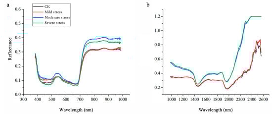 Average reflectance spectra of Salix matsudana × alba leaves under different salt stress levels. (a) Vis range; (b) NIR range.