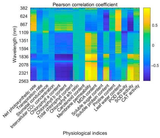 First, Pearson correlation coefficients were calculated to examine the linear relationships between spectral reflectance values and physiological indicators. This analysis helped identify key wavelengths that were strongly correlated with specific physiological parameters, thus revealing the spectral regions most sensitive to different levels of salt stress.