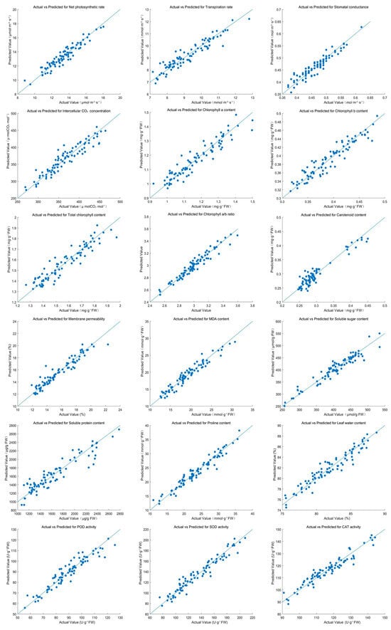 Proline content and leaf water content achieved R2 values of 0.93 and 0.92, underscoring the model’s capability to predict osmotic adjustment and water status. Antioxidant enzyme activities, including SOD, POD, and CAT, showed exceptionally high predictive accuracy, with SOD achieving an R2 of 0.97.