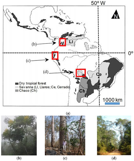 (a) Distribution of seasonally dry tropical forests in America, including savanna (llanos and cerrado) and Chaco biomes. Red boxes indicate the locations of study sites (from N to S): inter-Andean valleys in southwestern Colombia (b), Tumbesian forests near the Pacific Ocean coast in southwestern Ecuador (c) (note the Ceiba spp. succulent stems), and the “Chiquitano” forest in southeastern Bolivia (d) (note the road for selective logging). The map was created using Maptive software (https://www.maptive.com/, v.1, URL accessed on 13 January 2025), and it was modified from [11]. The map projection is equirectangular.