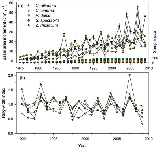 Mean series of basal area increment (BAI) (a) and ring-width indices (b) for the tree species measured in the Ecuadorian TDF. In plot (a), bars show the number of samples measured each year (right y axis). BAI values are means ± SE.