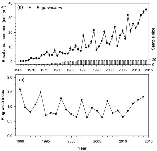 The BAI series of B. graveolens sampled in Ecuador also showed the ascending phase typical of young trees, with a high year-to-year growth variability (Figure 3).