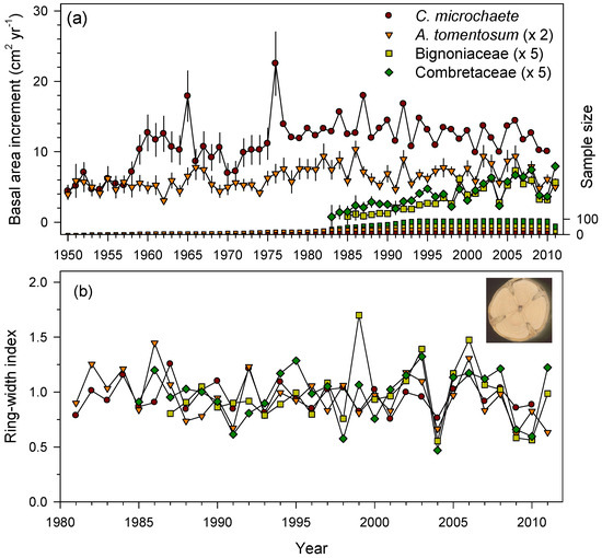 Mean series of basal area increment (BAI) (a) and ring-width indices (b) for the tree and liana species measured in the Bolivian TDF. In plot (a), bars show the number of samples measured each year (right y axis). BAI values are means ± SE. Some series were multiplied by 2 (×2, A. tomentosum) or by 5 (×5, liana species) to improve visibility. In plot (b), the image shows a liana cross-section.