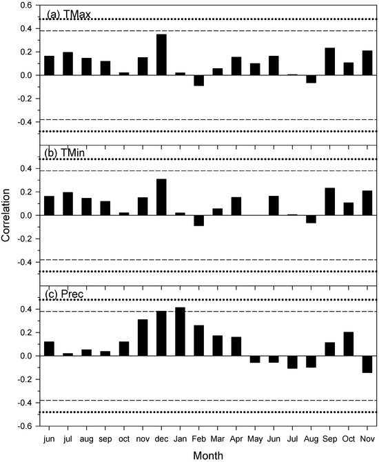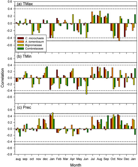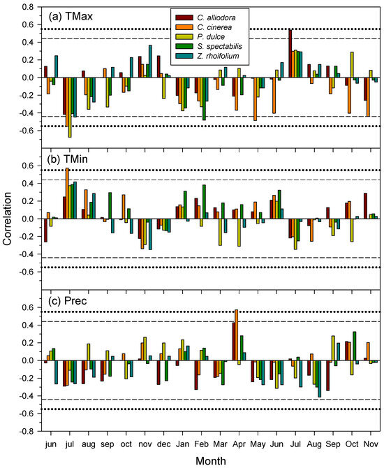 Climate–growth relationships calculated for the tree species measured in the Ecuadorian TDF. The bars are Pearson correlations computed by relating the species’ series of ring-width indices with monthly climate variables ((a) TMax, mean maximum temperature; (b) TMin, mean minimum temperature; (c) Prec, total precipitation). Correlations were calculated from the previous (months abbreviated by lowercase letters) to the current (months abbreviated by uppercase letters) year. Dashed and dotted horizontal lines indicate the 0.05 and 0.01 significance levels, respectively.