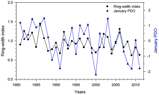 Due to the lack of long-term, homogeneous climate series near the study sites, we obtained monthly climate data (TMax, mean maximum temperature; TMin, mean minimum temperature; Prec, total precipitation) from the 0.5°-gridded CRU database v. 4.07 [39]. Year-to-year rainfall variability in the study TDFs depended on El Niño–Southern Oscillation (ENSO), which may have affected their growth rates [35,40]. During warm phases of the ENSO (“El Niño” episodes), precipitation increases and growth is enhanced, as has been observed in Ecuadorian TDFs [41]. To quantify the ENSO variability, we used monthly series of the Southern Oscillation index (SOI), sea surface temperature anomalies in the “El Niño” 3 + 4 area (El Niño 3.4) across the tropical Pacific (lat. 5° N–5° S, long. 120–170° W), and the Pacific Decadal Oscillation (PDO) considering the period 1981–2010 [42,43]. These data were downloaded using the Climate Explorer web portal (http://climexp.knmi.nl, URL accessed on 9 January 2025).