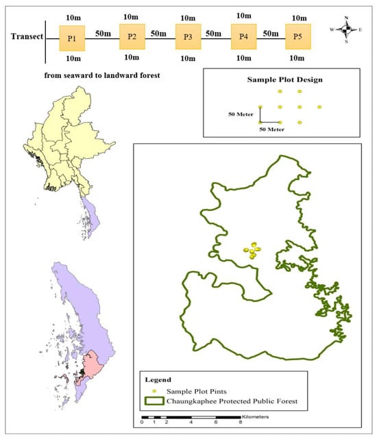 The field data collection was performed in February and March 2024, at the end of the rainy season. A non-destructive approach was used, integrating line transect and quadrat sampling techniques across various research sites. Each sampling station featured a 100 m line transect with a 10 × 10 m quadrat placed every 50 m along the line (Figure 1). Transects were oriented perpendicular to the coastline, extending from the landward to the seaward edge of the mangrove forest, with a total of 19 sampling plots established within the natural mangrove stand of Chaungkaphee PPF.