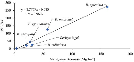 Relation between mangrove biomass (Mg/ha) and importance value index (IVI) in natural mangrove stand.