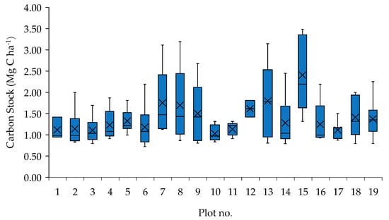 Carbon stocks of the sampling plots. Boxplots show the mean (middle mark), median (middle line), quartiles (boxes), and 1.5 times the interquartile range (IQR) (whiskers).
