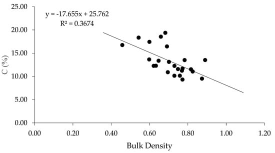 Figure 4 presents a scatterplot depicting the relationship between bulk density and carbon content. A total of 19 data points is plotted, showing a general trend of decreasing carbon content with increasing bulk density. The coefficient of determination (R2 = 0.3674, p < 0.05) indicates a moderate fit of the model to the data, suggesting that approximately 36.74% of the variation in carbon content can be explained by the variation in bulk density. Overall, the plot indicates an inverse relationship between carbon content and bulk density, highlighting that as bulk density increases, carbon content tends to decrease. Soil bulk density is indicative of moisture and ventilation conditions, which can influence the oxidation of sequestered carbon, leading to CO2 loss. Generally, bulk density decreases as %C increases [42,43].