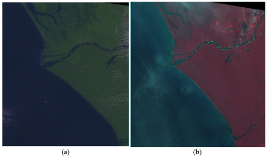 Colour composite of the study site: (a) natural false colour, (b) false colour.