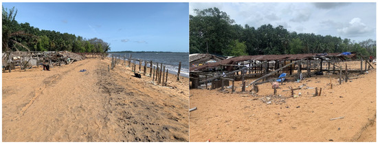 The period from 1990 to 2000 showed a high intrusion of build-up within the park, and a decrease from 2010 through to 2022. This decrease in settlement can be related to climate change’s impact on sea level rise that has led to coastal sedimentation and the burial of some settlements in the area (Chart 2). Land cover changes and the development of numerous human activities in the area have subjected the natural space to a variety of risks that exacerbate the vulnerability of populations to climate change. With deforestation and the degradation of mangroves, the role of a natural green barrier that prevents coastal erosion and limits the propagation of invasive plants is broken. Mangroves play a crucial role in defending the coastline from impairment due to waves and tropical storms, mitigating risks of erosion and flooding to coastal communities [49]. However, communities in DENP are, increasingly, exposed to climate change risks such as coastal erosion and flooding. In the villages Yoyo 1, Youme 2, and Mbiako, coastal and river sedimentation is causing considerable damage to homes (Chart 2). Many villages and camps in the national park are situated on the shoreline with no safe distance between the sea and homes, making them vulnerable to flooding, sedimentation, and erosion. This exposure combined with coastal erosion and sedimentation aggravates flooding during high tides. In line with our study, ref. [54] in their study to evaluate mangrove forest dynamics in the same area that, then, was still under the status of a reserve, observed a decrease in settlement by 47.21 km2 between the years 2001 and 2015.