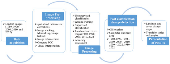 Data and image acquisition: To quantify the forest extent of the mangroves and understand its dynamics of change over several decades, a set of Landsat images—Landsat 1, Landsat 5, Landsat 7, and Landsat 8—were analysed and compared for the years 1980, 1990, 2000, 2010, and 2022 (Table 1). This was done to reflect changes in nine classes of land cover change, degradative, and restitution stages of mangrove forest, viz. bare ground, Nypa palms, settlements, coastal sedimentation, river sedimentation, regeneration, matured mangroves, dense forest, and water body. The data were acquired from an open-source platform, the United States Geological Survey “http://glovis.usgs.gov/ (accessed on 16 November 2023)”. This platform provides free images according to “acquisition date” and “location”. All the satellite images downloaded were those captured during the dry season between December and April.