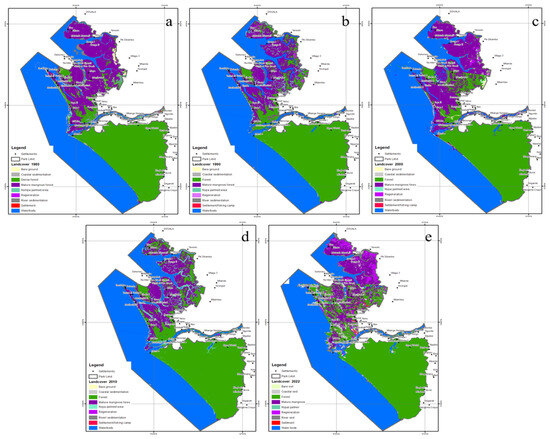 Distribution maps of mangrove land cover for the years 1980 (a), 1990 (b), 2000 (c) 2010 (d), and 2022 (e).