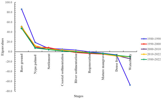Trends in eigenvalues matrices of the different time intervals of mangrove reconstituted stages.