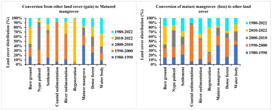 Mangrove loss is a result of the conversion of mangrove forests to other land covers, as well as mangrove gains, that is, the conversion from other uses to mangroves within each decadal and entire period (Figure 5). Between 1980 and 1990, a large chunk of mature mangrove forest was lost/converted to other uses, mostly settlement, waterbody, and bare ground, while mangrove gain was mostly from bare ground and settlement during the same period. From 1990 to 2000, there was a net loss in mangroves as a result of conversion to coastal sedimentation, river sedimentation, and settlement. Mangrove gain was highest from regeneration, both artificial and natural, bare ground, and river sedimentation, while loss was, mostly, as a result of conversion to bare ground and regeneration sites during the period 2010–2022.