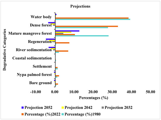 Mangrove projections for 2032, 2042, and 2052 were conducted based on the cover change in 2022. It illustrated that the bare ground, which is a result of the over-exploitation of mangroves to the point where the ground is bare, will decline by 2.49% in 2052, while the area covered by settlement and coastal sedimentation will increase by 0.23% and 0.46%, respectively. As shown in Figure 6, mature mangrove cover was projected to increase by about 4.19%, 46.06%, and 50.24% in the years 2032, 2042, and 2052 in that order, whereas, the projection of mangrove regeneration demonstrated a decline in those same years by 1.63%, 17.91%, and 19.54%, respectively.