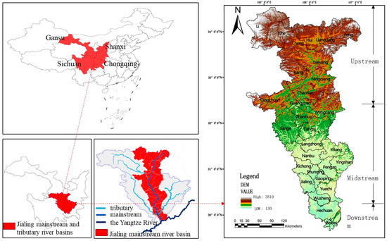 The Jialing River Basin exhibits complex and diverse topography, characterized by higher elevations in the northern, western, and eastern regions, with a gradual decline toward the southeast. Geomorphologically, it can be categorized into three zones: the northern mid-mountain area, central low-mountain hilly region, and southern parallel ridge-valley terrain. The basin experiences a subtropical monsoon climate with distinct seasons, featuring a multi-year average temperature of 11–18 °C. Annual humidity progressively increases from the upper to lower reaches, notably peaking between September and December. Precipitation typically exceeds 1000 mm annually, with the most abundant rainfall occurring from June to October, reflecting its distinctive “autumn rain-dominated” hydrological regime. As one of the most socioeconomically developed and rapidly urbanizing mountainous watersheds in Southwest China, the Jialing River Basin exhibits typical characteristics of ecological vulnerability, high disturbance sensitivity, and low resilience capacity [42].