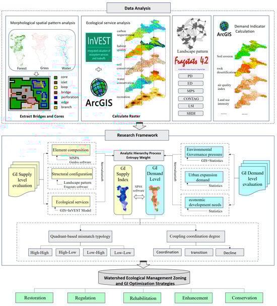 Amidst rapid urbanization, unregulated anthropogenic activities have triggered a cascade of ecological crises across river basins, including severe soil erosion, habitat degradation, and deteriorating human settlement quality [1]. In recent years, the paradigm of “ecological primacy and green development” has progressively supplanted the singular pursuit of economic performance [2]. Implementing spatially targeted management zones and optimization strategies for forest-based green infrastructure (GI) has emerged as a critical pathway toward achieving sustainable human–nature harmony in watershed systems [3]. Given the pronounced spatial disparities in ecological resource distribution and inter-county socioeconomic heterogeneity, identifying the spatial patterns and coupling mechanisms of GI supply and demand is essential for enhancing ecological governance efficiency [4]. This spatially explicit approach provides a scientific foundation for advancing integrated ecological protection and restoration within territorial spatial planning frameworks, while simultaneously promoting high-quality urban–rural development [5].