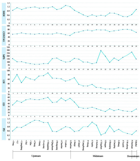 In terms of urban and social development, land use intensity, population density, and urbanization rates were higher in urban areas, including Lizhou District, Shunqing District, and Beibei District. Counties with higher per capita GDP included Fengxian, Shunqing District, Hechuan District, and Beibei District. The proportion of the tertiary industry showed relatively small fluctuations across counties, with higher values observed in Lixian, Xihe County, Kangxian, and Shunqing District.