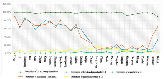 From the perspective of element composition (Figure 4 and Figure 5a,b), the proportions of forest, grass, and ecological core areas in GI varied significantly across counties, with clear distinctions between the upper, middle, and lower reaches. The indices for counties in the upper and lower reaches were generally higher than those in the middle reach. The proportion of GI in county land use, as well as the coverage of connectivity corridors and water areas, showed minimal variation from upstream to downstream, with only slight fluctuations. The counties in the upper reach were dominated by large-scale GI ecological cores and corridors, with counties such as Fengxian and Qingchuan exhibiting the most optimal GI composition. The middle reach, on the other hand, was characterized by smaller ecological cores, corridors, and isolated patches, with the central urban area of Nanchong and the counties of Wusheng and Yuechi in Guang’an facing a significant GI deficit compared to other regions. The lower reach, located in the eastern Sichuan parallel mountain–valley region, had better distribution of ecological cores and corridors than the middle reach, as exemplified by Beibei District.