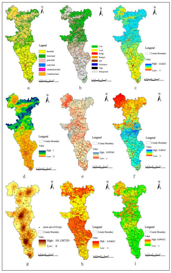 (a) Land use; (b) MSPA result; (c) carbon sequestration; (d) habitat quality; (e) soil conservation; (f) water yield; (g) recreation; (h) rocky desertification; (i) soil erosion.